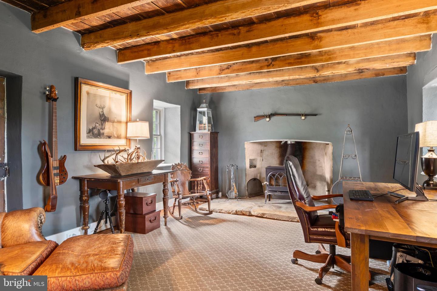 The second floor features three spacious bedrooms, including the primary suite with a spa-like renovated en-suite bath. The fully finished third floor adds two additional bedrooms and a full bath--ideal for guests, a home office, or creative pursuits. The original stone wing offers a versatile space with a private home office featuring a wood burning stove, and an additional living room and bedroom--perfect for an in-law suite or extended stay guests.
